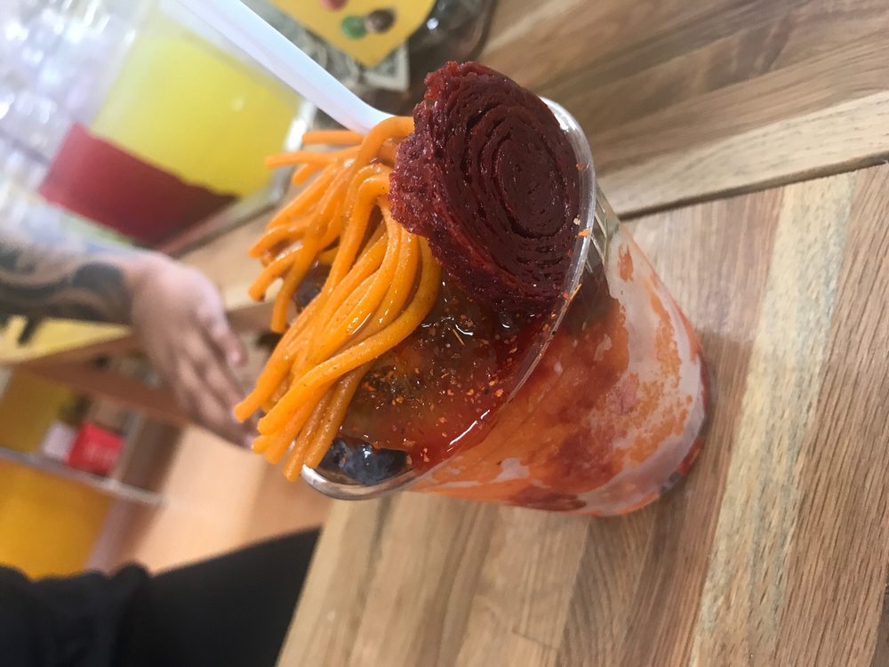 Pickle wrapped in a fruit roll up with Chamoy and tajin